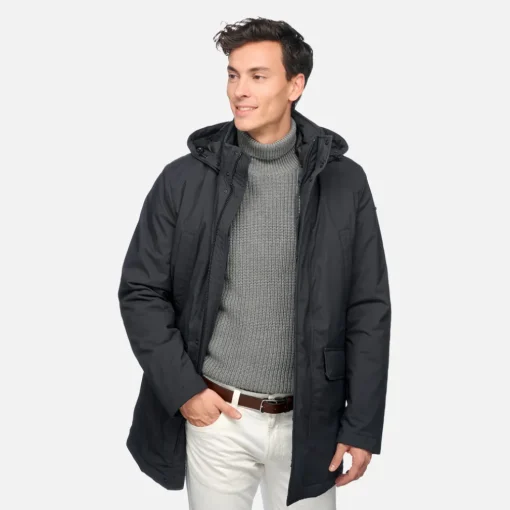 Lange Herrenjacke mit normaler Passform, die sich dank ihres funktionalen und vielseitigen Stils für den täglichen Gebrauch eignet. Andalo, hier im dezenten Nachtblau, ist mit einer praktischen Kapuze und einer Innenweste, beide abnehmbar, ausgestattet. Das Modell aus mattem Polyester mit wind- und wasserfesten Eigenschaften hat eine Wattierung aus warmer recycelter Watte EcologicWARM.