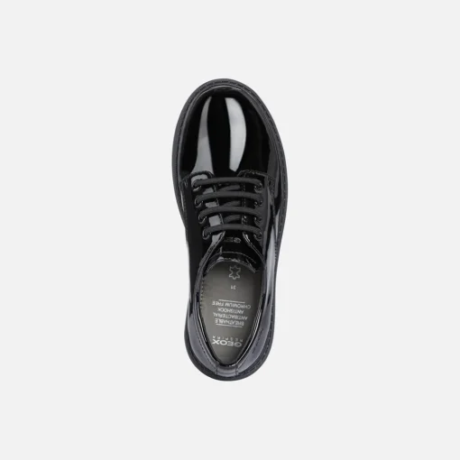 Casey ist ein Schuh im formellen Derby-Stil mit Oxford-Details und ist aus Material in Lacklederoptik in Total Black gefertigt. Das Modell eignet sich perfekt zur Schulkleidung oder zu Outfits bei besonderen Anlässen.