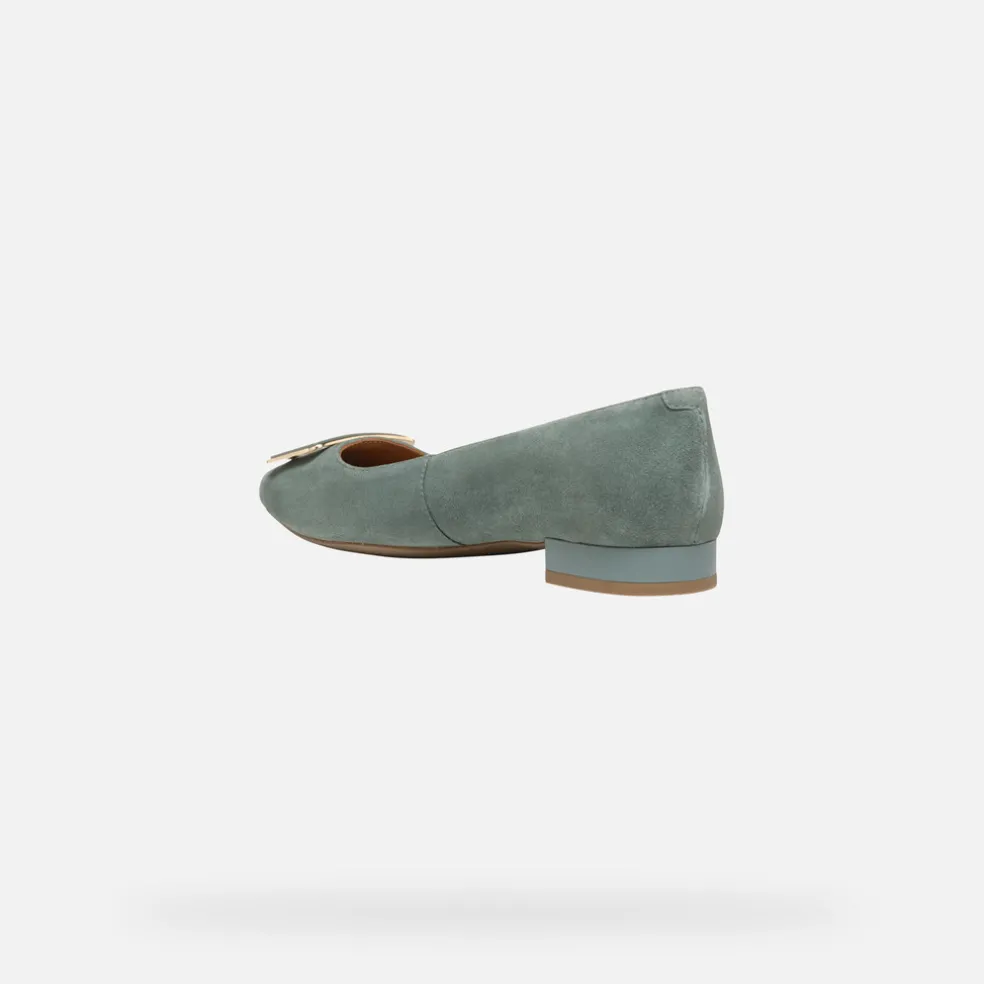 Eleganter Damenballerina mit spitz zulaufender Zehenpartie und bequemem niedrigem Absatz, der Leichtigkeit und Atmungsaktivität bietet. Das Obermaterial aus geschmeidigem Wildleder wird hier in der dezenten Farbvariante Salbeigrün vorgeschlagen und wird von einem Schmuckdetail abgerundet. Charyssa ist seinem urbanen und ultra-femininen Design der ideale Schuh von morgens bis abends, vom Büro bis zum Aperitif.