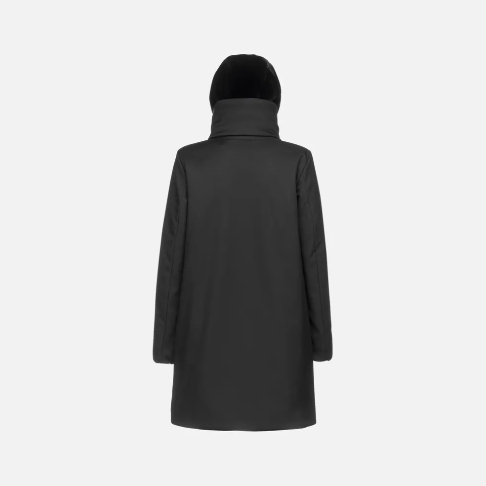Langer Damenparka mit glatter Außenseite im modernen und femininen Stil für kalte Tage. Das Modell aus Softshell wird hier in der vielseitige Farbvariante Total Black vorgeschlagen und ist mit einer Wattierung aus recycelter Watte EcologicWARM ausgerüstet. Desya ist mit einem abnehmbaren Brustteil und mit Kapuze aus Recycling-Gewebe in Kunstfelloptik ausgestattet, ideal für das Leben in der Stadt.