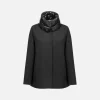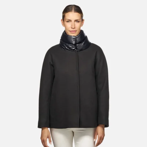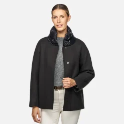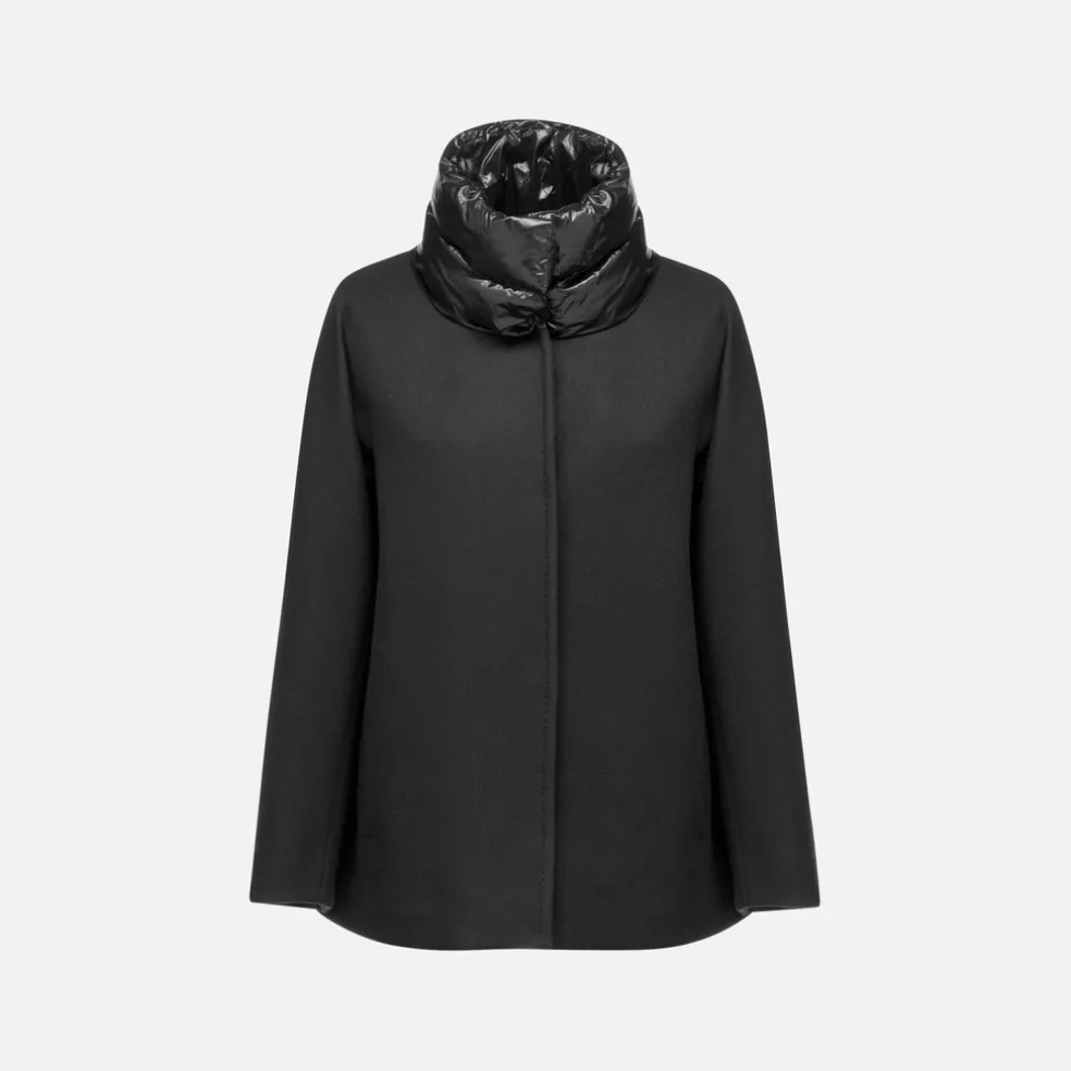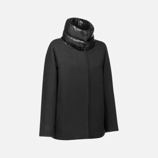 Kurzer winddichter Damenmantel mit verdecktem Verschluss im modernen Urban-Look. Das Modell aus Gewebe in Wolloptik mit Details aus glänzendem Nylon am weiten und einhüllenden Kragen wird hier in Schwarz vorgeschlagen. Diamanta weist eine gesteppte Innenseite auf und ist mit Wattierung aus recycelter Watte EcologicWARM gefüttert, ideal zu allen Outfits für die Stadt.