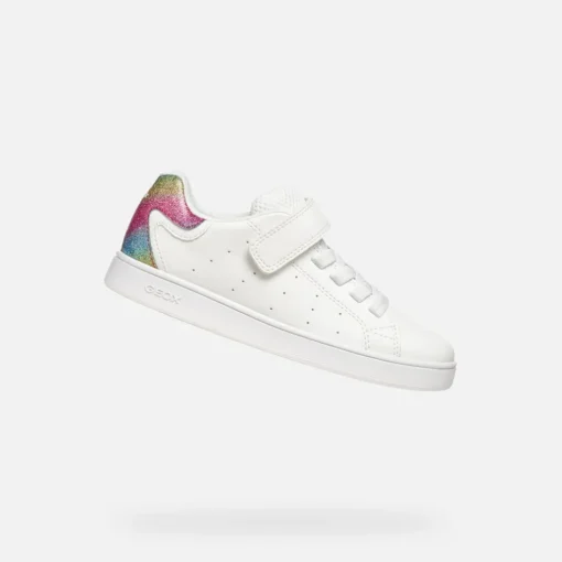Low-Cut-Sneaker für Mädchen im lässigen Tennisdesign, leicht kombinierbar. In dieser Variante in Weiß mit mehrfarbigen Details ist Eclyper der perfekte Schuh, um Alltagsoutfits eine leuchtende Note hinzuzufügen. Das Modell aus Material in Lederoptik und in Lederoptik mit Glittereffekt schließt mit elastischen Schnürsenkeln und Klettverschluss und lässt sich dadurch praktisch und bequem anziehen.