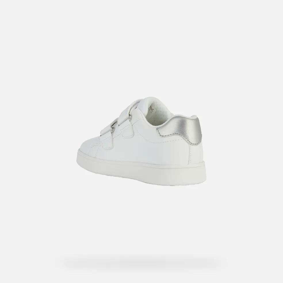 Low-Cut-Sneaker für Mädchen im Tennisstil mit praktischem Doppelklettverschluss. In dieser Variante in Weiß mit schillernden Silberdetails ergänzt der Schuh jedes Alltagsoutfit, ob in der Schule oder in der Freizeit. Das bequeme und leichte Modell aus Material in Lederoptik präsentiert sich feminin, perfekt für den Casual-Look.