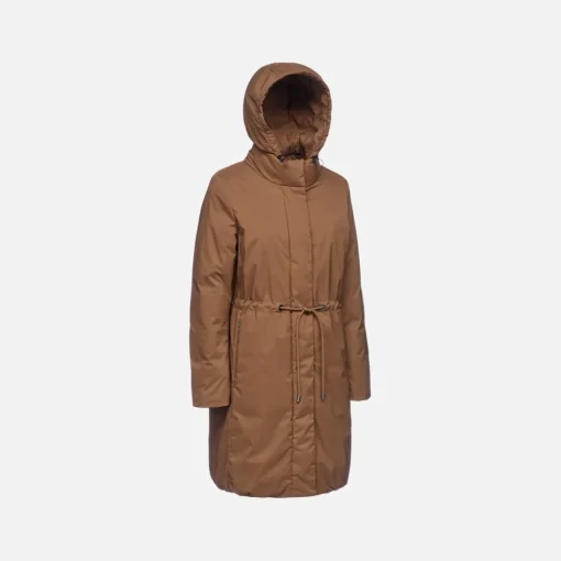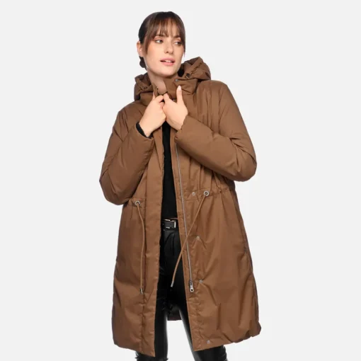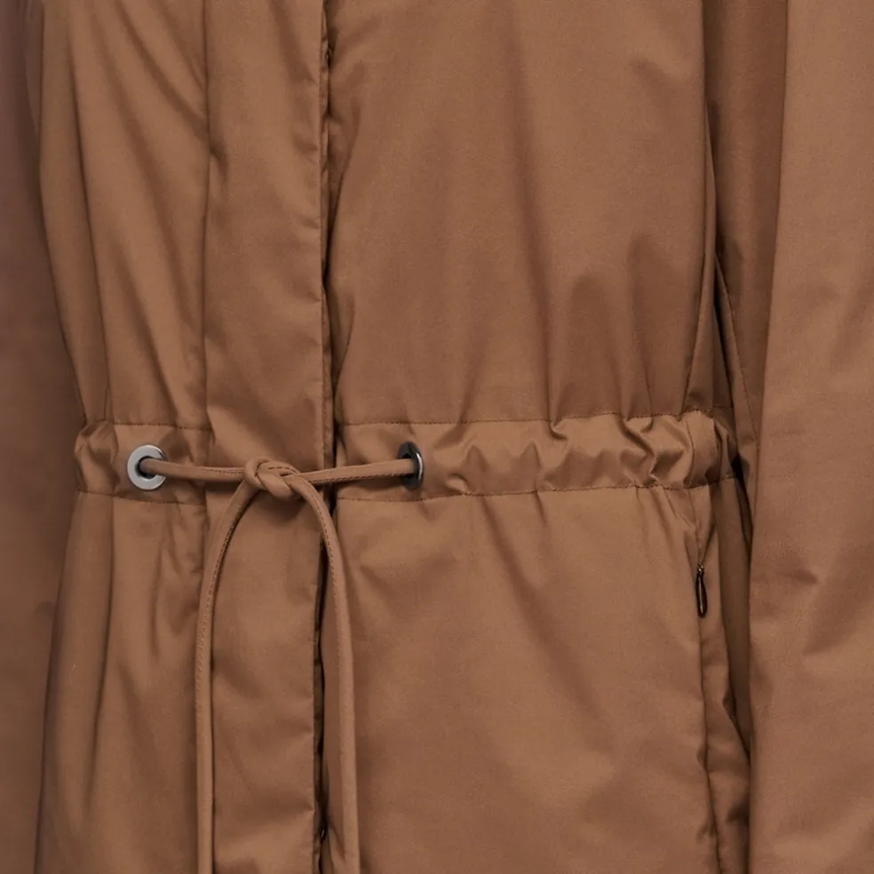Lange wattierte Damenjacke im modernen und funktionalen Stil in lässig-schickem Look. In dieser attraktiven Version in gebranntem Braun ist Eleana aus mattem Polyestergewebe mit weichem Griff und gestepptem Innenfutter in Kontrastfarbe gefertigt. Das Modell verfügt über eine abnehmbare Kapuze, drei praktische Innentaschen und Tunnelzug zur Betonung der Taille: die perfekte Jacke für die Stadt und auf Reisen.