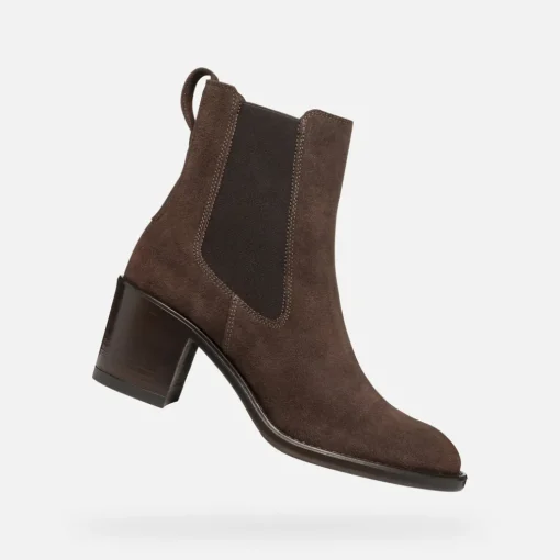 Angenehm zu tragende, atmungsaktive Damenstiefelette mit bequemem Blockabsatz. Farnia – ein feminines Modell im klassischen Stil – ist der perfekte Begleiter für die Stadt. Das Modell aus weichem Veloursleder präsentiert sich hier in einer eleganten dunkelbraunen Variante, die perfekt zu jedem Outfit passt.