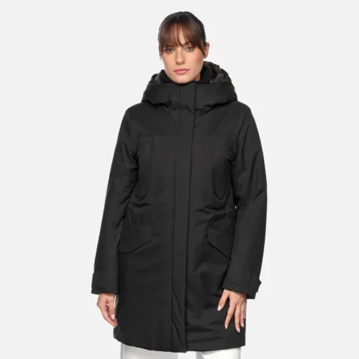 Damenparka mit Wattierung im zeitgemäßen Minimal-Look, perfekt bei jeder Wetterlage. Felicity ist ein bequemes, funktionales und schützendes Modell, auch an kälteren Tagen, und wird hier im klassischen und markanten Schwarz vorgeschlagen. Das Modell aus leichtem recyceltem Polyestertwill ist dank zweilagigem Gewebe wasser- und winddicht und hat eine praktische Kapuze und einen abnehmbaren, gesteppten Brustteil in Kontrastfarbe innen.