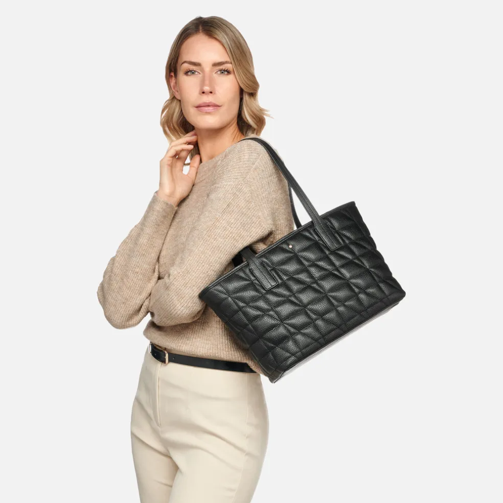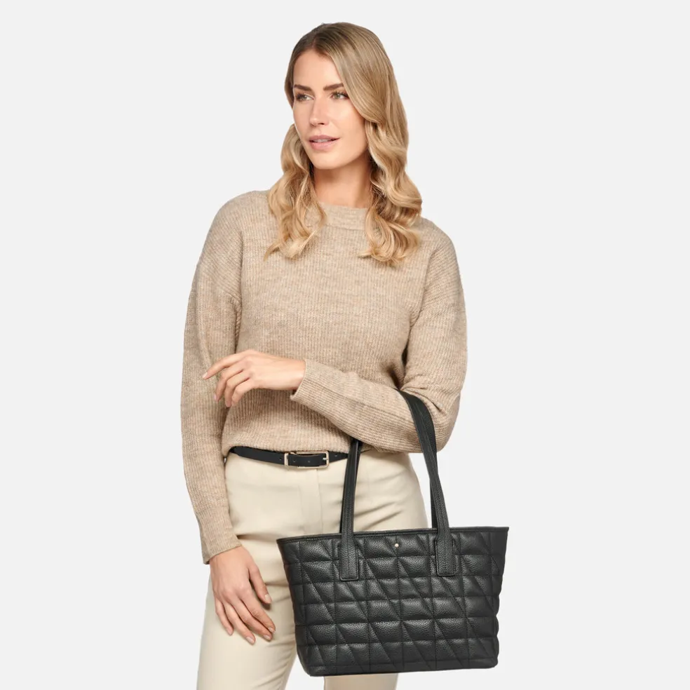 Praktischer und geräumiger Damen-Shopper, ideal zur Abrundung alltäglicher Outfits. Das Modell aus Walkleder in Steppoptik wird hier im markanten Schwarz präsentiert. Gardren M hat einen Reißverschluss und einen Doppelhenkel, ideal für alle, die verschiedene Termine in der Stadt erledigen müssen.