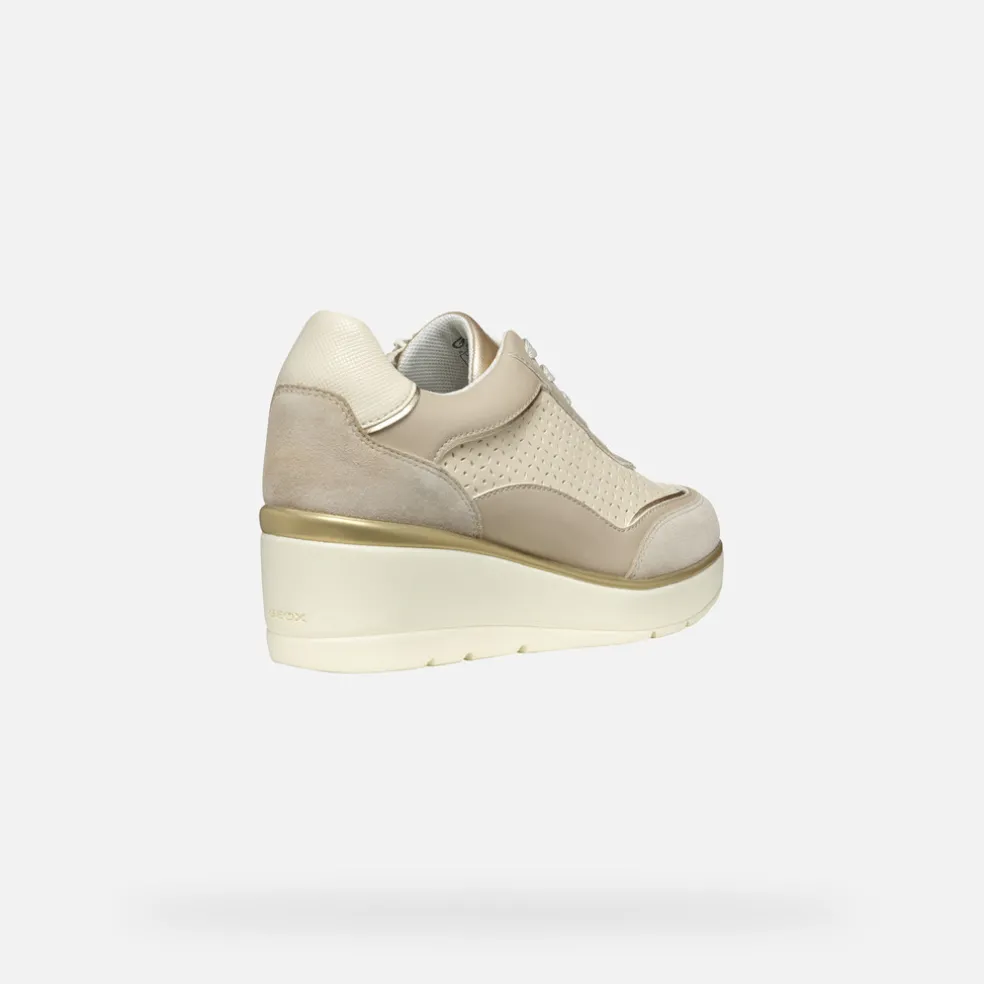 Damensneaker im lässigen und gleichzeitig sportlichen Stil für die angenehme Jahreszeit. Das Modell aus Material in Lederoptik und Veloursleder wird hier in einer ausgesuchten Farbkombination aus Beige und Hellbeige vorgeschlagen. Ilde ist ein leichter und atmungsaktiver Schuh mit bequemem und figurstreckendem Keilabsatz, der jedes Freizeitoutfit aufwertet.