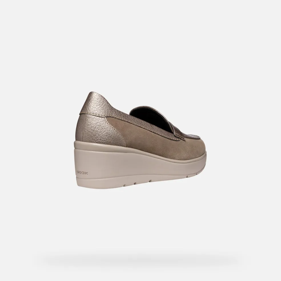 Damenmokassin mit komfortablem Keilabsatz im speziellen Hybriddesign, perfekt für das Leben in der Stadt. Das leichte, bequeme und atmungsaktive Modell aus Veloursleder und Material in Walklederoptik mit Perlenschimmer wird hier in der attraktiven Farbvariante Taupe präsentiert. Ilde rundet Alltagsoutfits problemlos ab und bietet nicht nur Halt beim Gehen, sondern hat auch eine figurstreckende Wirkung, wobei das Wohlbefinden des Fußes nicht zu kurz kommt.