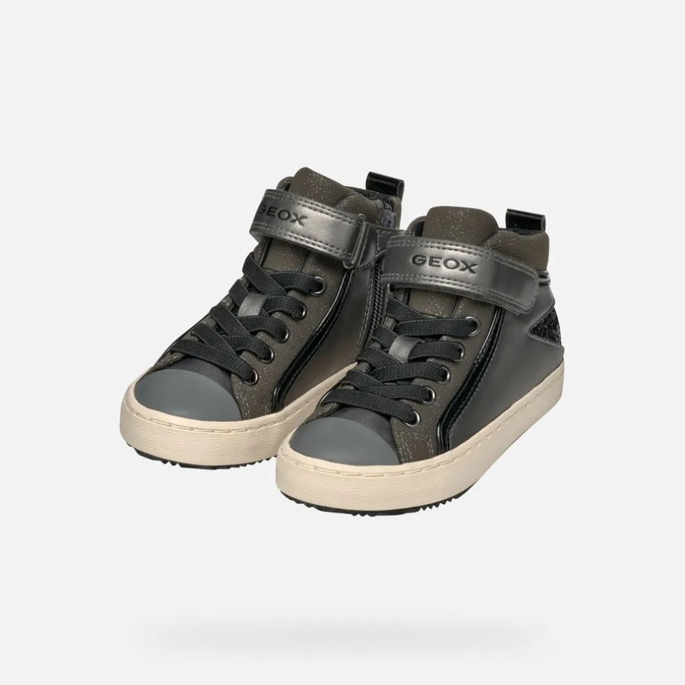 Mid-Cut-Sneaker für Mädchen im modernen Casual-Style, ideal für Schule und Freizeit. Kalispera, hier in Dunkelgrau mit schwarzen Details, weist glänzende Applikationen an der Ferse auf. Das Modell aus Material in Lederoptik mit Perlenschimmer und glänzendem Mesh besticht mit seinem trendigen Look mit Retroakzenten.