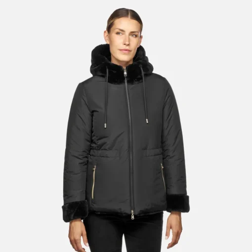 Kurze Damen-Wendejacke im femininen und zugleich funktionalen Stil mit Kapuze und Tunnelzug in der Taille. Das bequeme und moderne Modell zeigt sich auf der Außenseite aus recyceltem Taftgewebe und auf der Innenseite aus Kunstfell, beide in Schwarz. Kaula weist eine warme Wattierung aus recycelter Watte EcologicWARM auf und eignet sich perfekt zu City-Looks im Alltag.