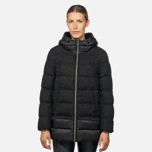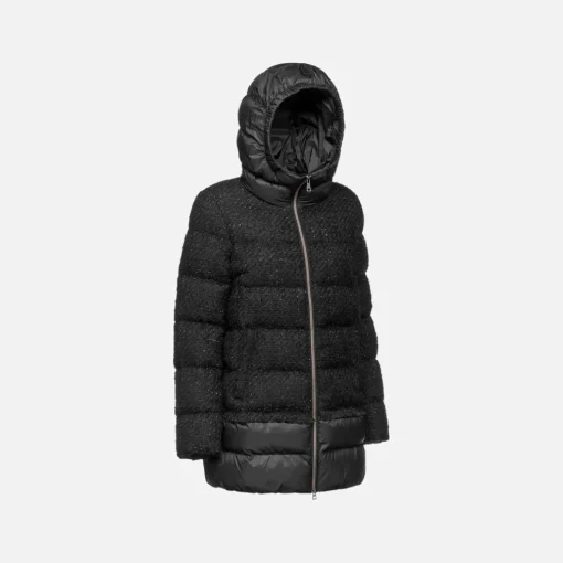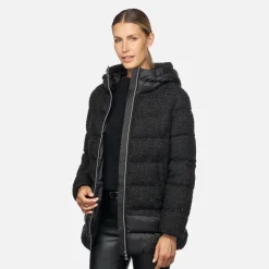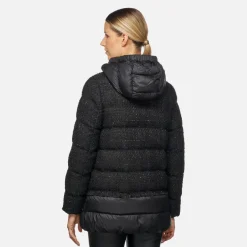 Langer Damen-Steppparka, der lässig-schicken Stil mit femininem Charme vereint. Die warme und angenehm zu tragende Jacke Manilva, hier in Total Black, ist mit einer Wattierung aus recycelter Watte EcologicWARM ausgerüstet. Das Modell aus recyceltem Nylon mit Details aus Textil mit Lurexfäden hat eine weiche und einhüllenden Kapuze.