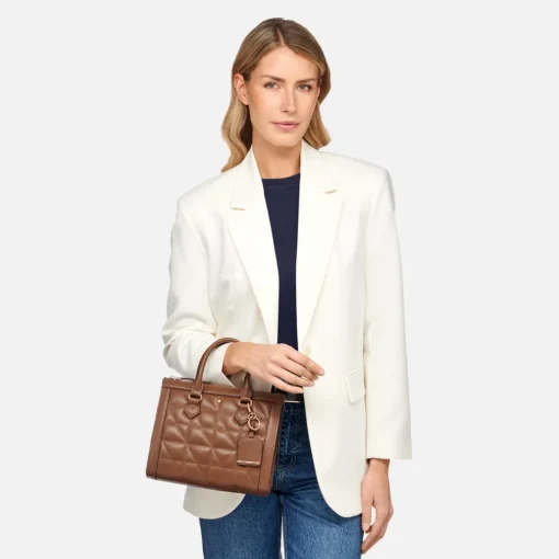 Mittelgroßer Damenshopper mit moderner Ästhetik und urbanem Design. Das Modell aus geschmeidigem Walkleder erhält durch die gesteppte Verarbeitung eine besondere Optik, in dieser Version im warmen und vielseitigen Farbton Schlamm. Olympiy ist alltagstauglich und doch besonders feminin. Das Modell besitzt zwei Henkel und einen praktischen Schulterriemen und passt sowohl fürs Büro als auch für die Freizeit.