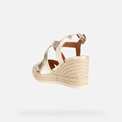 Bequeme und leichte Damen-Sandalette mit hohem Keilabsatz – ideal für die Stadt, aber auch für den Urlaub. Das Modell präsentiert sich hier in einer eleganten hellgoldenen Variante, mit einem Schaft aus Metallic-Leder in Kombination mit einer Sohle in Flechtoptik, die ihre Inspiration aus den ikonischen Espadrilles bezieht. Das feminine Modell Ponza streckt die Figur und ist mit seinem edlen Casual-Stil der ideale Schuh, um Sommeroutfits aufzuwerten.