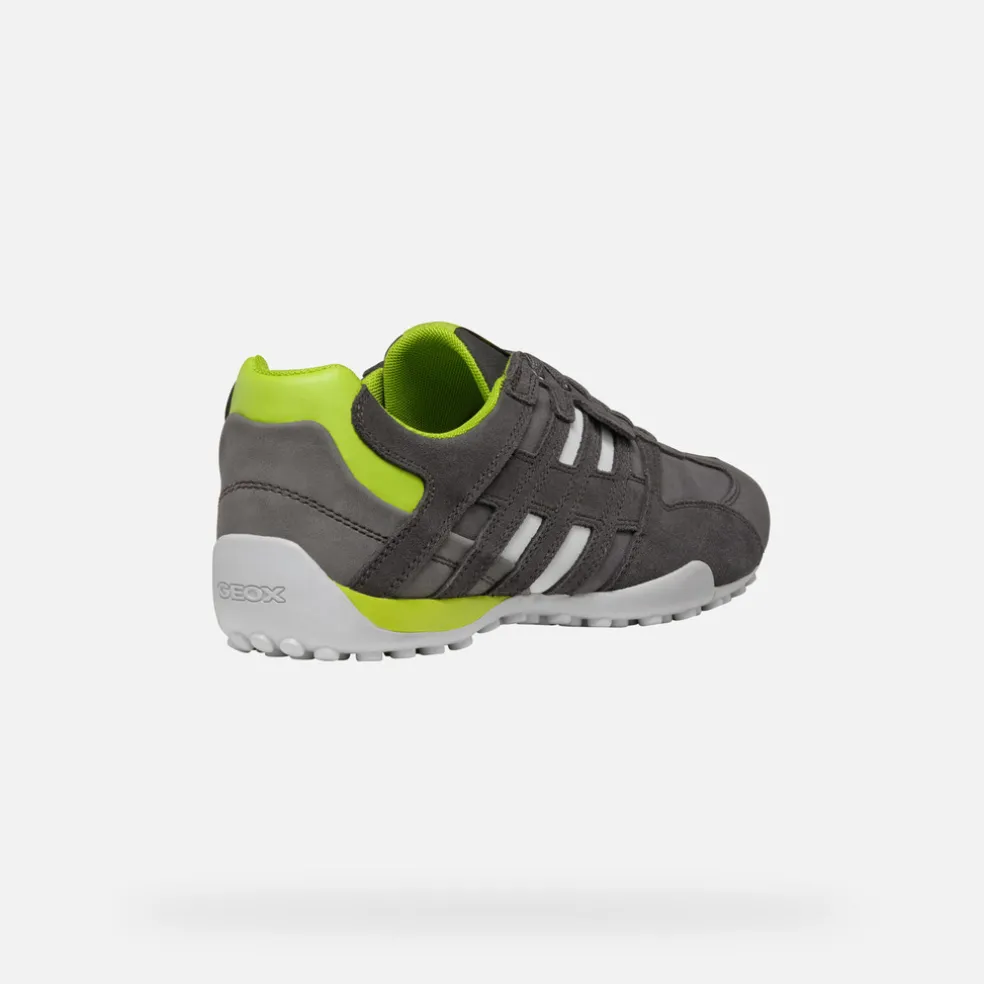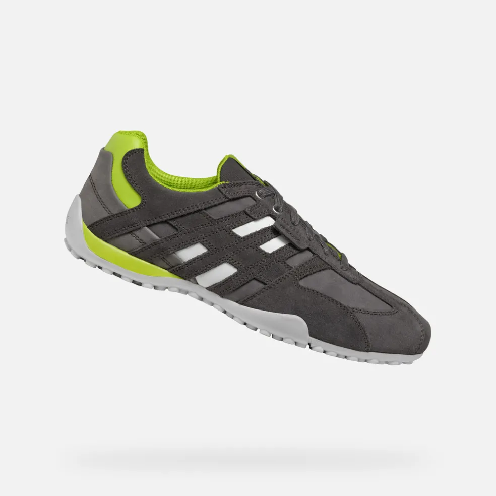 Leichter Herrensneaker im sportlichen und dynamischen Stil – perfekt für Freizeitaktivitäten. Das Obermaterial aus Veloursleder und Material in Nubukleder-Optik setzt auf Kontraste und präsentiert sich hier in einer außergewöhnlichen Variante in Anthrazitgrau mit Details in Lime. Snake garantiert Komfort und Atmungsaktivität und rundet informelle Stadtlooks mit einem Akzent im Active-Style ab.