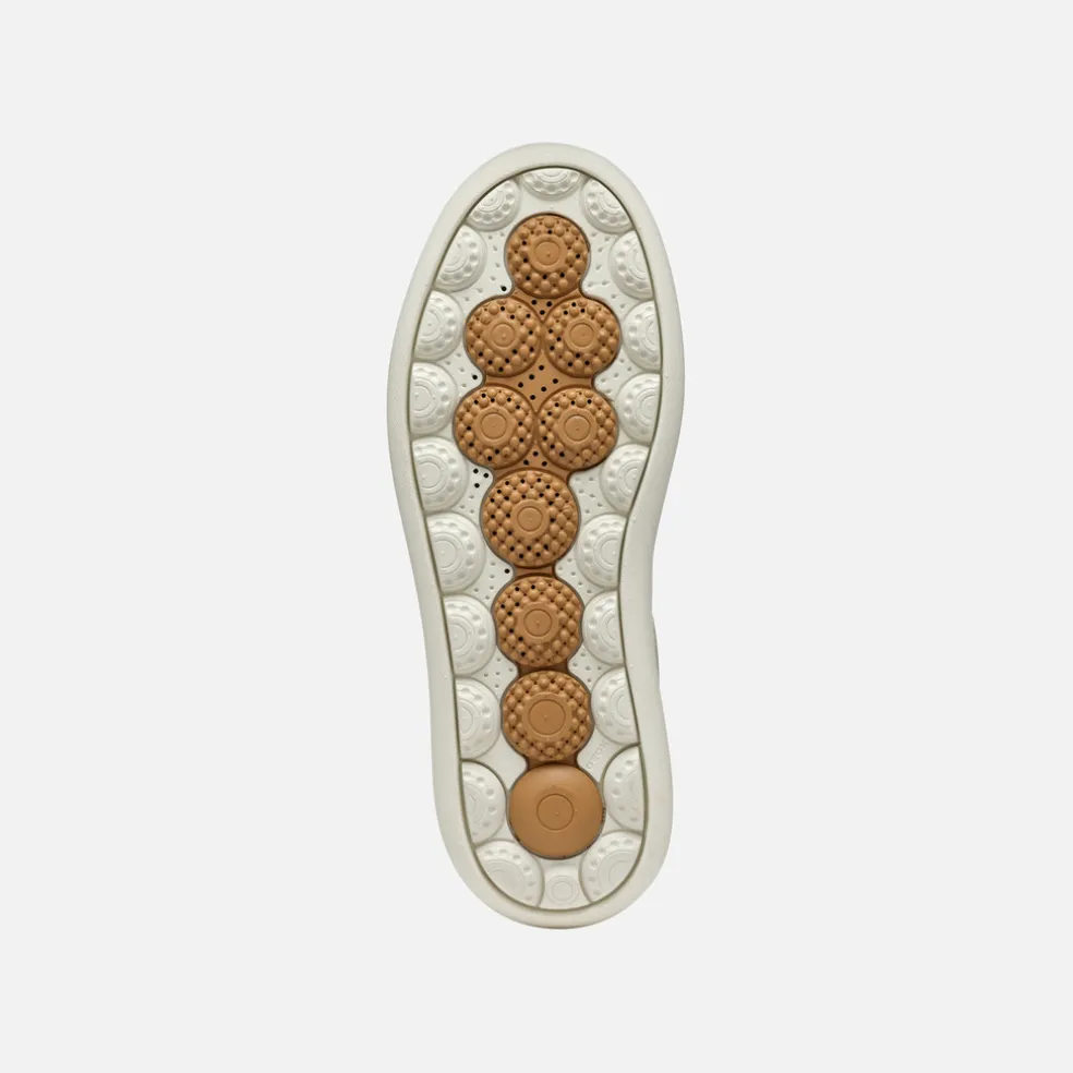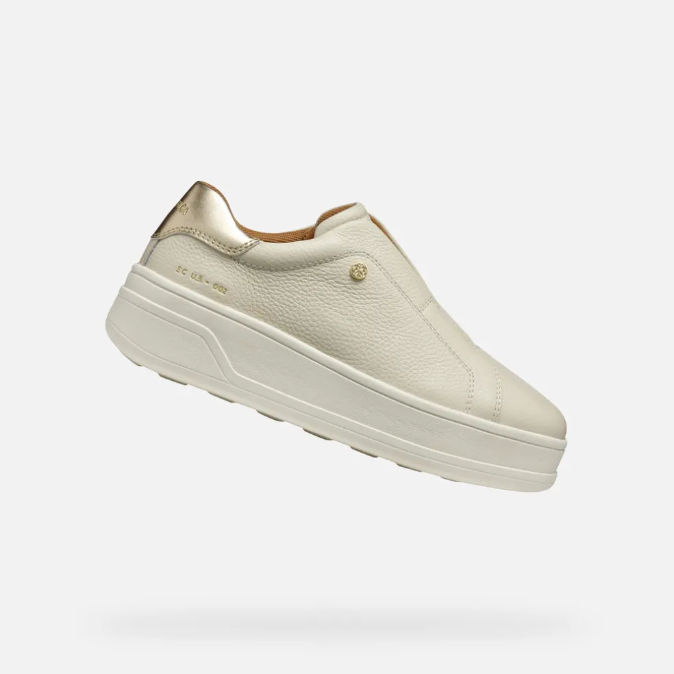 Slip-on-Sneaker für Damen im lässigen Stil mit Plateausohle, der sich dank leichtem Einstieg bequem tragen lässt und perfekte Stoßdämpfung bietet. Das Modell wird hier in einer Farbkombination in Off-White und Hellgold vorgeschlagen und ist aus gewalktem Leder und Material in Metallic-Lederoptik gefertigt. Spherica™ ECUB-2 fügt Alltagslooks einen sportiven Touch hinzu und eignet sich auch perfekt auf Reisen.