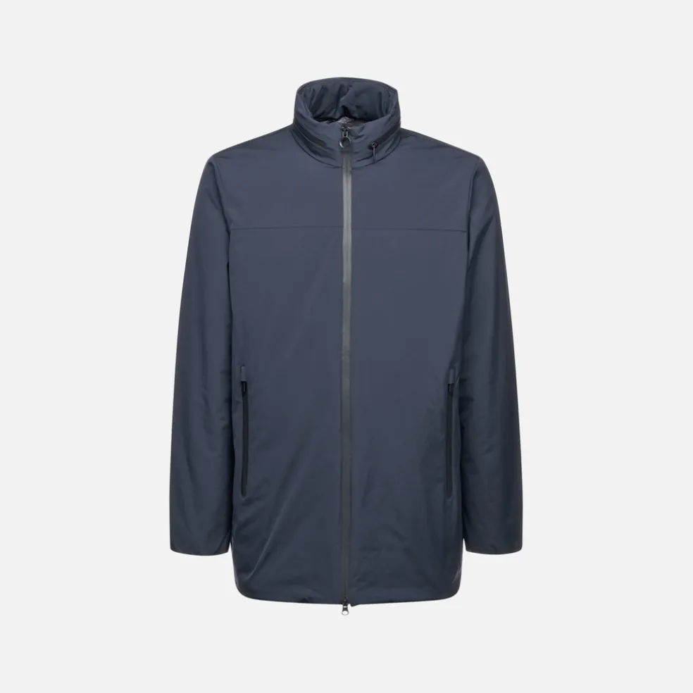 Lange, glatte und wattierte Herrenjacke im aktuellen Minimal-Design, ideal für die täglichen Unternehmungen. Spherica™ ist sehr angenehm zu tragen und atmungsaktiv, hat zwei praktische Taschen und einen Tunnelzug am Saum, hier in der Variante im zeitlosen Nachtblau. Das Modell aus elastischem Taftgewebe ist wasserabweisend und winddicht und weist eine praktische Kapuze auf, die im Kragen mit Reißverschluss zusammengerollt werden kann.