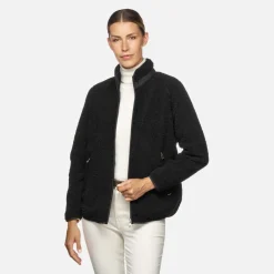 Warme und angenehm zu tragende Damen-Sweatjacke mit Reißverschluss und Kragen, die Atmungsaktivität garantiert. In dieser vielseitigen Variante in Schwarz weist das Modell zwei bequeme Seitentaschen mit Reißverschluss auf. Das Modell eignet sich perfekt für die Freizeit, aber auch zu lässigen Alltagslooks und ist aus weichem Recycling-Gewebe in Teddy-Optik gefertigt.