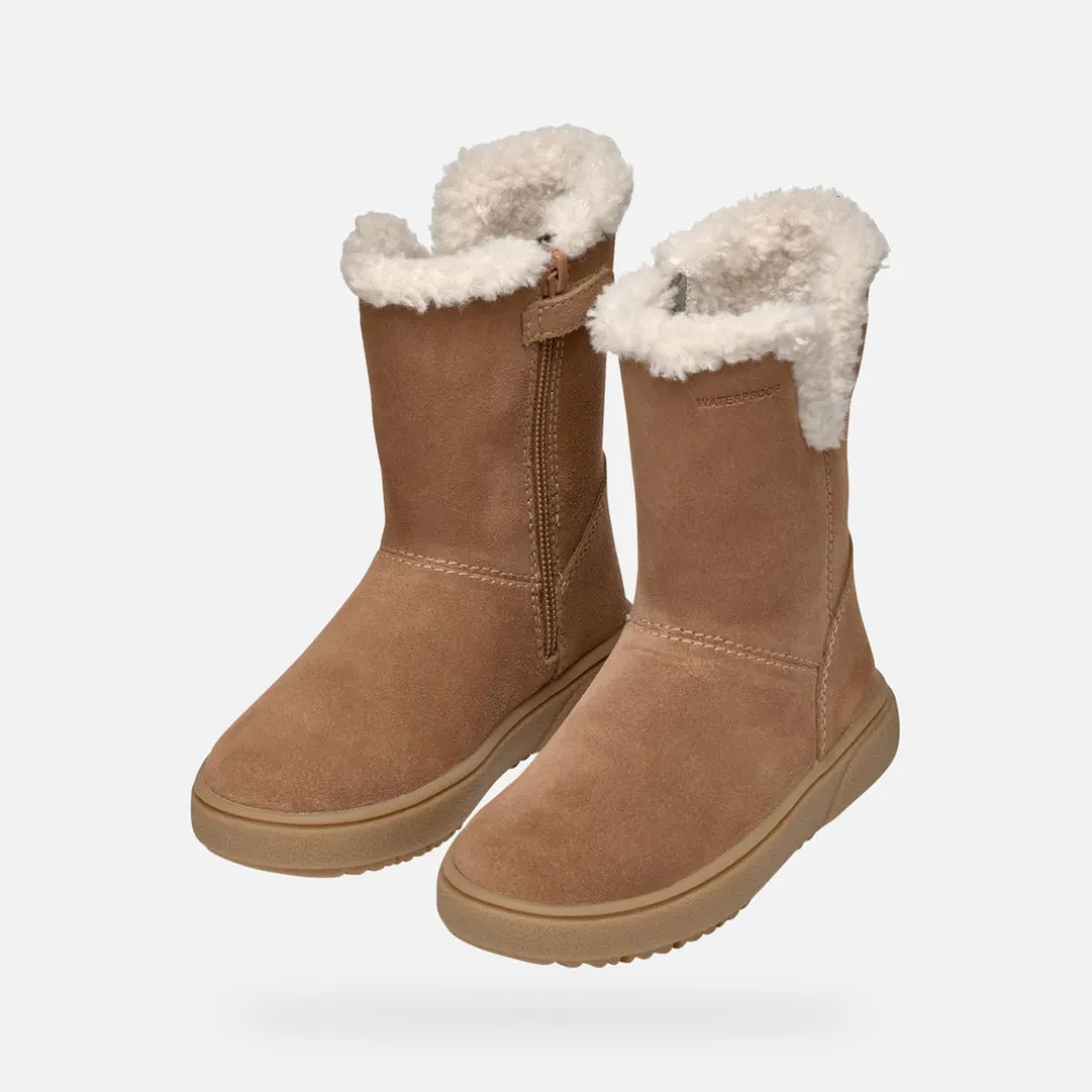 Warmer und trendiger Slip-on-Stiefel für Mädchen, ein Must-have in der kalten Jahreszeit. Theleven, hier im ansprechenden Farbton Cognac lässt sich leicht zu Outfits für die Schule oder das Wochenende kombinieren. Das Modell aus geschmeidigem Veloursleder mit Kunstfelldetails ist wasserfest und bietet den ganzen Tag lang Schutz und Komfort.