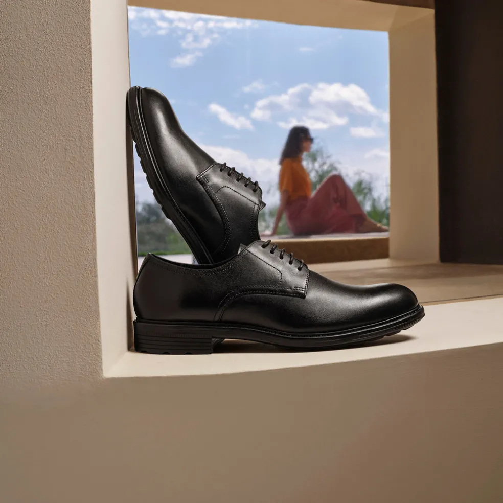 Formeller Herrenschuh im schlichten Stil mit urbaner Optik, der für ein leichtes Gehgefühl und Stoßdämpfung sorgt. Diese zeitgemäße Überarbeitung eines klassischen Derby-Schuhs wird hier aus Glattleder im klassischen Schwarz vorgeschlagen. Walk Pleasure eignet sich perfekt sowohl zu besonderen Anlässen als auch zu täglichen Businesslooks und bietet Komfort und Atmungsaktivität.