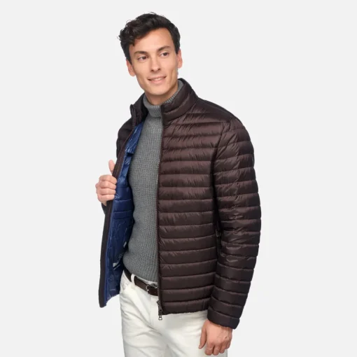 Kurze, ultraleichte Herren-Daunenjacke mit wind- und wasserfesten Eigenschaften, die perfekte Kombination aus Komfort und Wärme. Das Modell aus recyceltem in 20-den-Nylon mit Steppung wird hier im ausgesuchten Farbton Dunkelbraun vorgeschlagen. Diese lässige Übergangsjacke Warrens lässt sich zusammenfalten, um sie in der Stadt oder bei Ausflügen am Wochenende immer griffbereit zu haben.