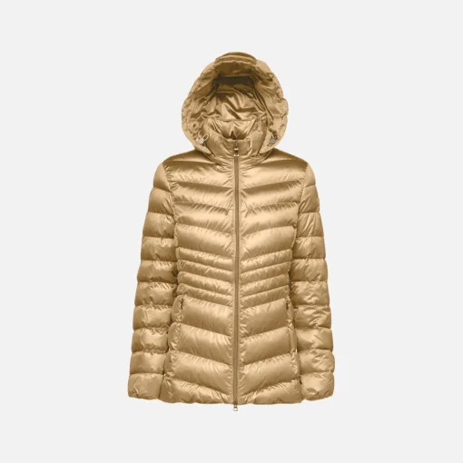 Kurze Damenjacke mit abnehmbarer Kapuze, ideal für die kalten Monate. Zosma ist ein alltagstaugliches Modell mit femininer und taillenbetonender Silhouette, hier in der ansprechenden Farbvariante Sand. Das lässige und zugleich edle Modell ist aus glänzendem Satin gefertigt und weist eine Wattierung aus warmer recycelter Watte EcologicWARM auf.