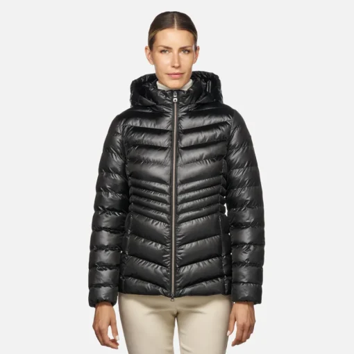 Kurze Damenjacke mit abnehmbarer Kapuze, ideal für die kalten Monate. Zosma ist ein alltagstaugliches Modell mit femininer und taillenbetonender Silhouette, hier in der Farbvariante Schwarz. Das lässige und zugleich edle Modell ist aus glänzendem Satin gefertigt und weist eine Wattierung aus warmer recycelter Watte EcologicWARM auf.